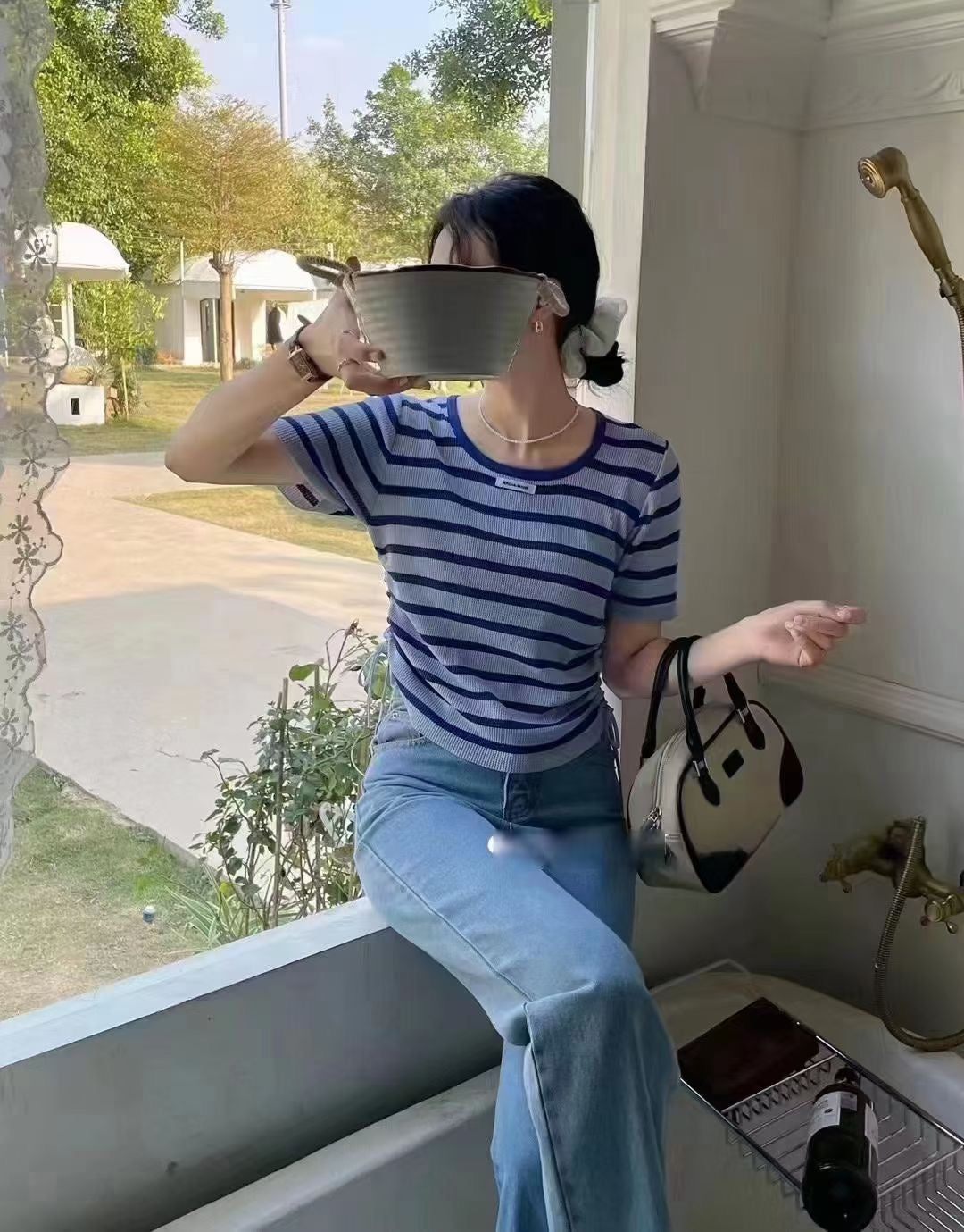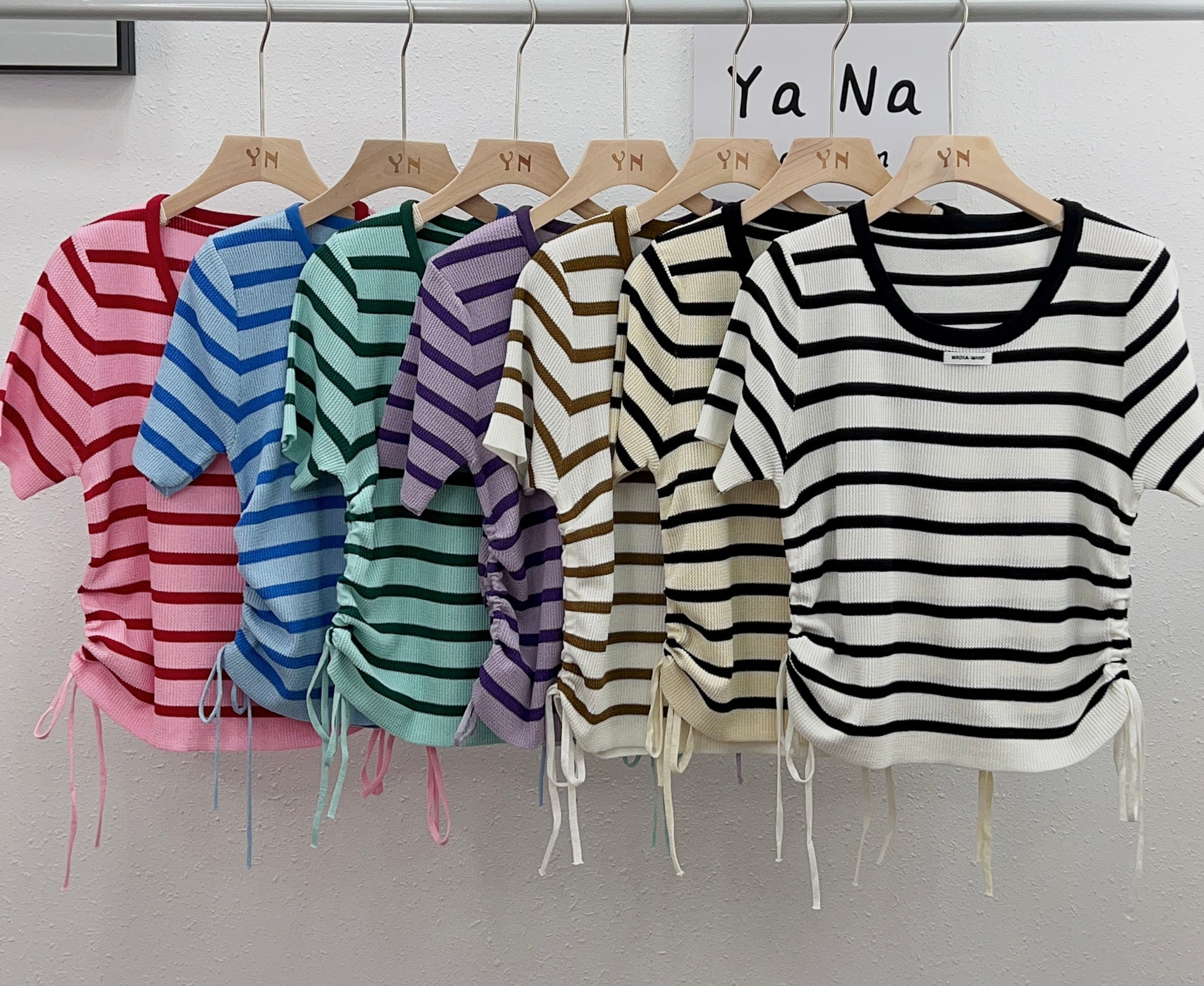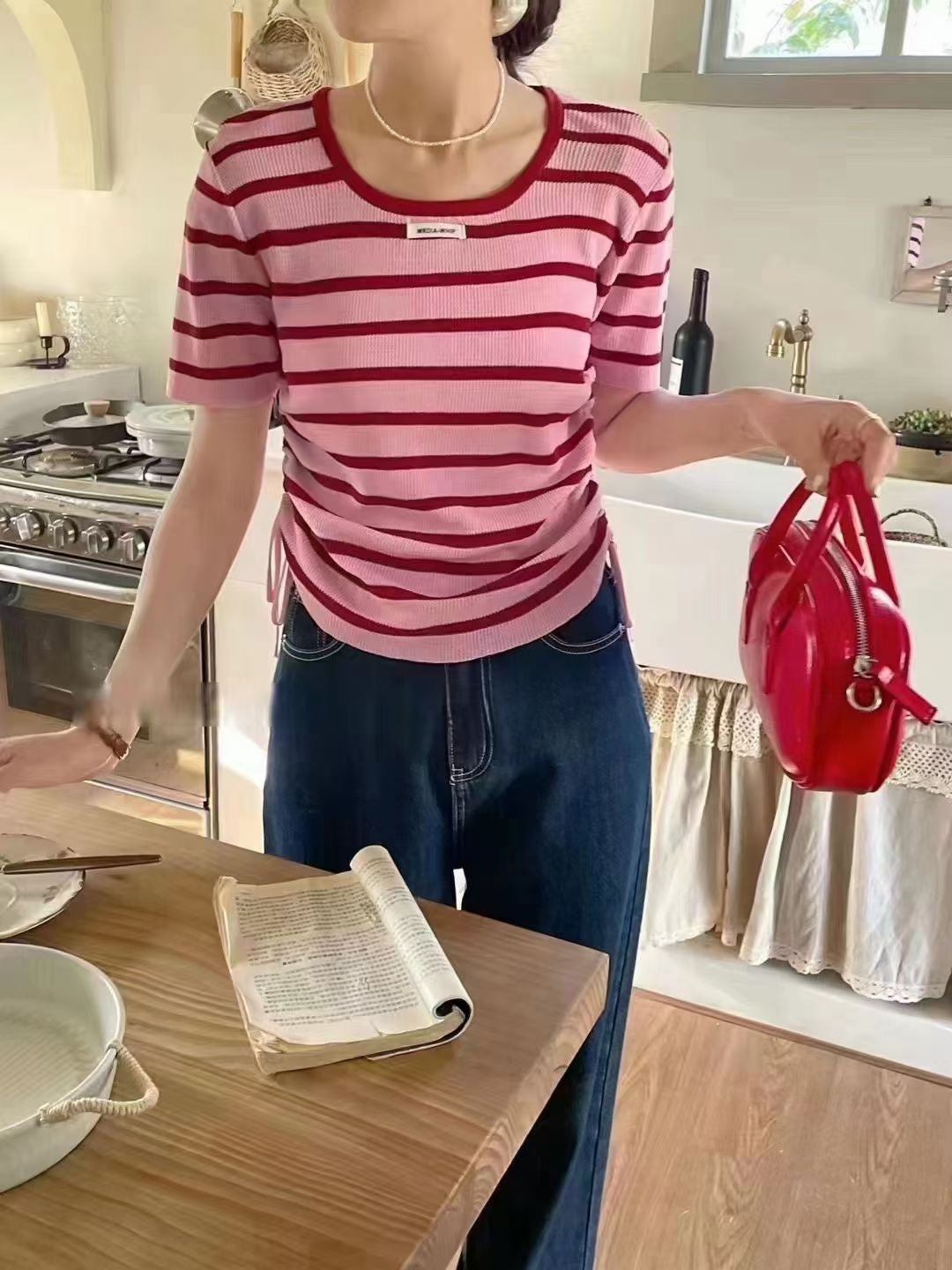 3115 Summer new style knitted short sleeve striped T-shirt chic draw rope round neck short top Striped