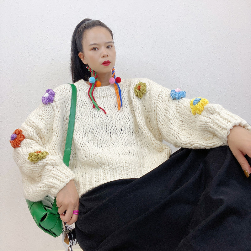 ULOVED New handmade flower thickened loose pullover knit sweater for women
